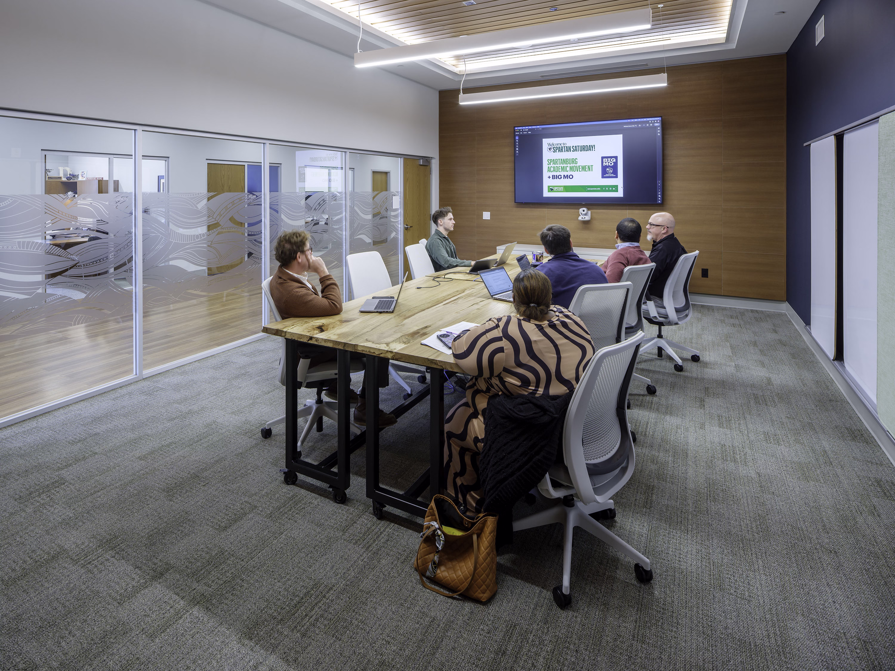 “We intentionally incorporated wood native to South Carolina, allowing the interior environment to also function as an educational tool that highlights the diversity of regional species,” says Moseley interior designer, Meaghan Howze. “The harvested wood was also designed into custom wall panels installed throughout the building in tiered classrooms, team rooms, conference rooms, and faculty and staff offices. This design element further strengthens the connection between Clemson’s academic mission and the surrounding natural resources.”