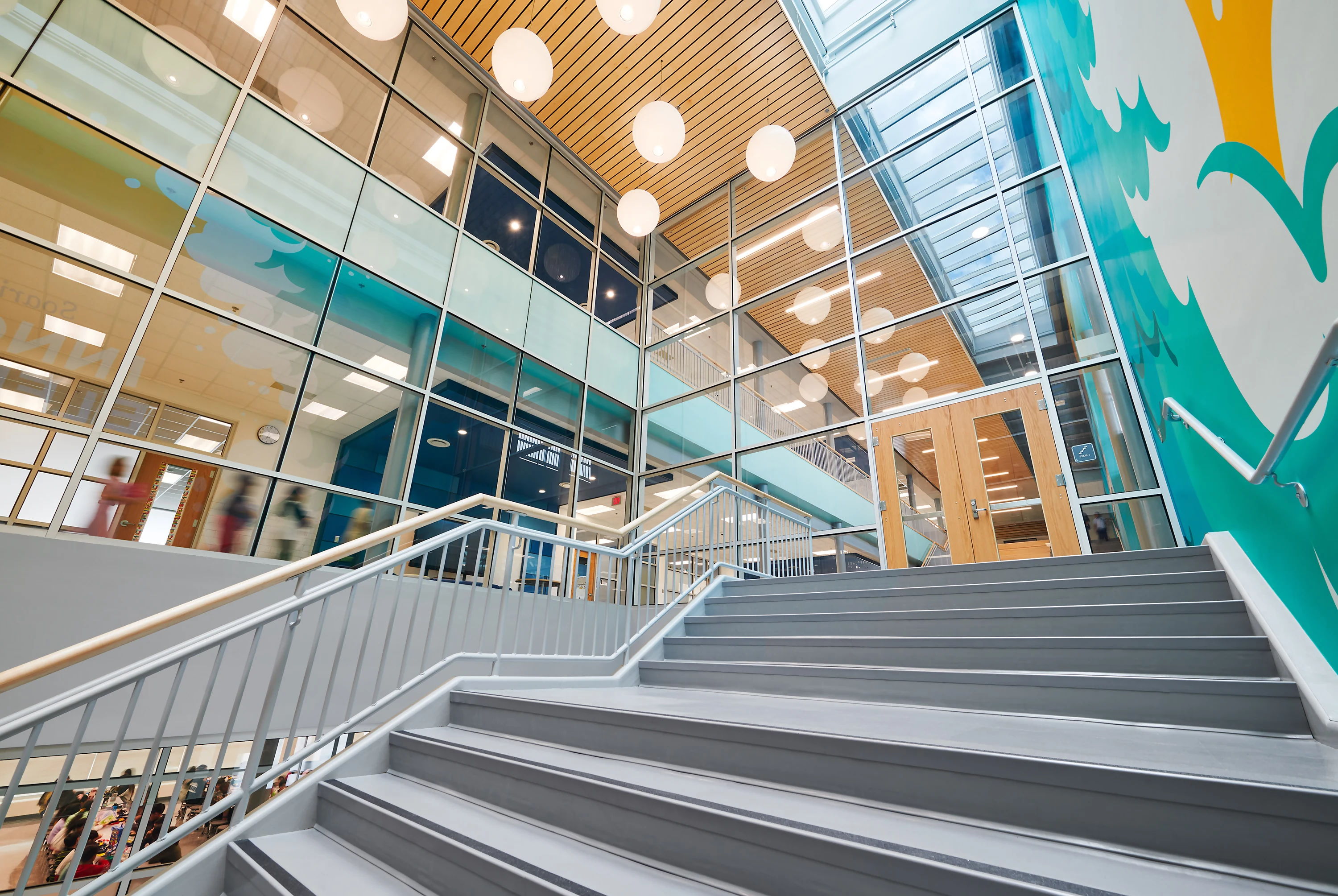 At the building's core, a two-story collaboration area captures sunlight through expansive windows and an overhead skylight. Here, students work in teams and share discoveries. The learning stair linking the second and third floors serves multiple roles: presentation space, gathering spot, and even a story time nook where classes gather for reading.
