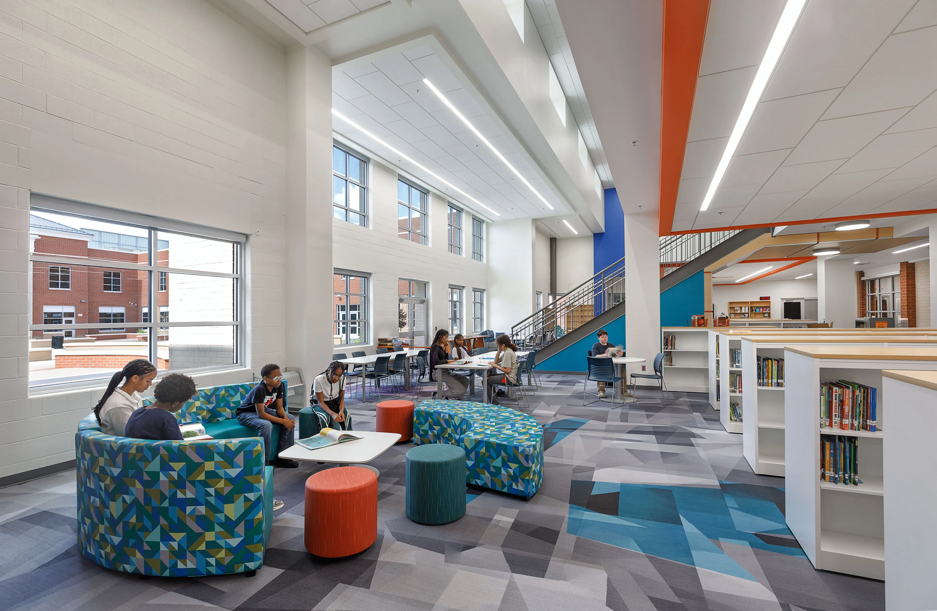 The design team created spaces for the diverse student population, including the 75 percent who receive free or reduced lunch. A central stair connects three floors, serves as a gathering spot between classes, and provides space for class presentations. The Media Center occupies the middle level's central location. The layout places sixth grade on the west side and seventh and eighth grades on the upper level, each with dedicated stair towers. This arrangement eliminates the need for students to cross through other grade levels to reach shared spaces.