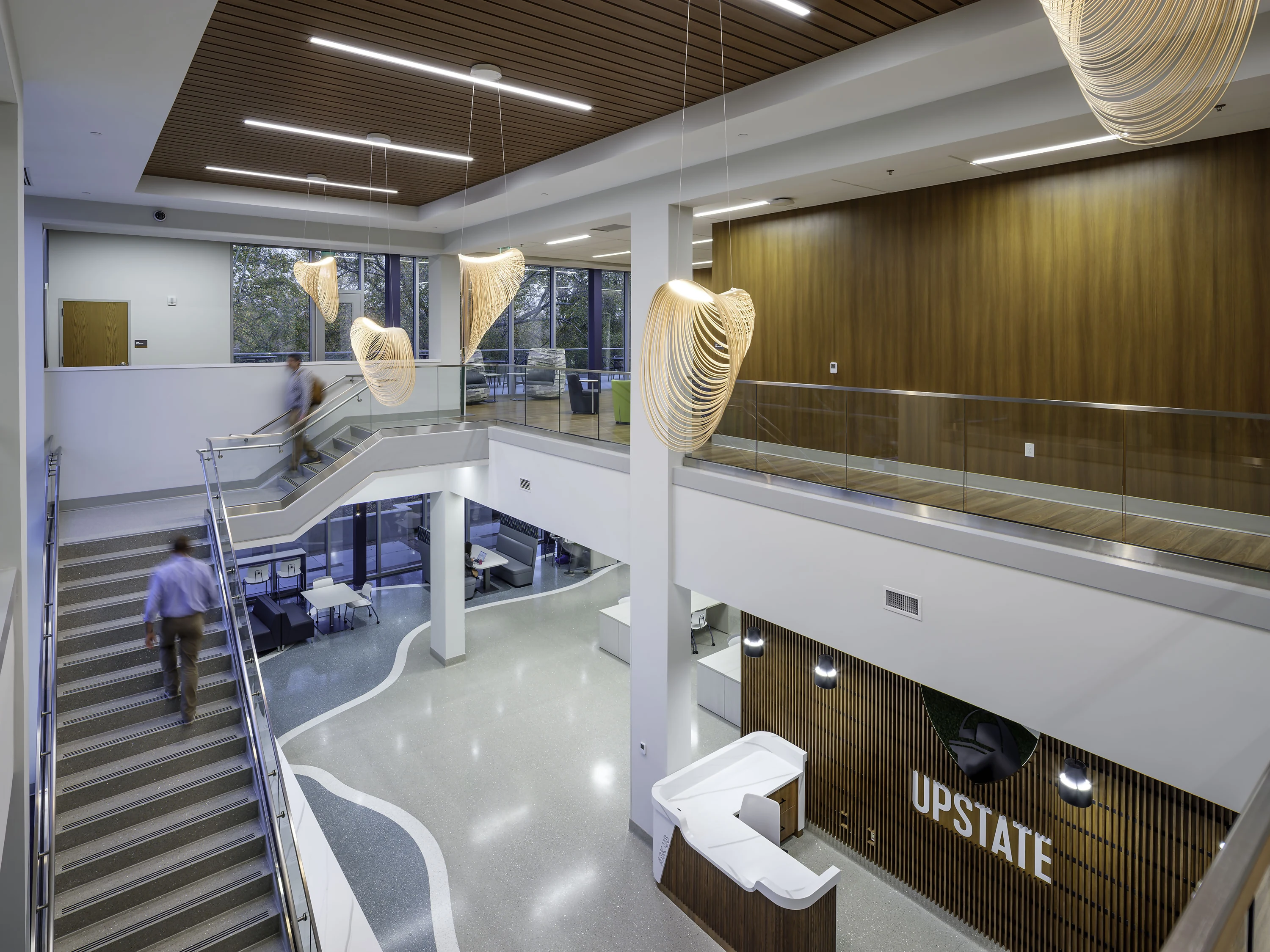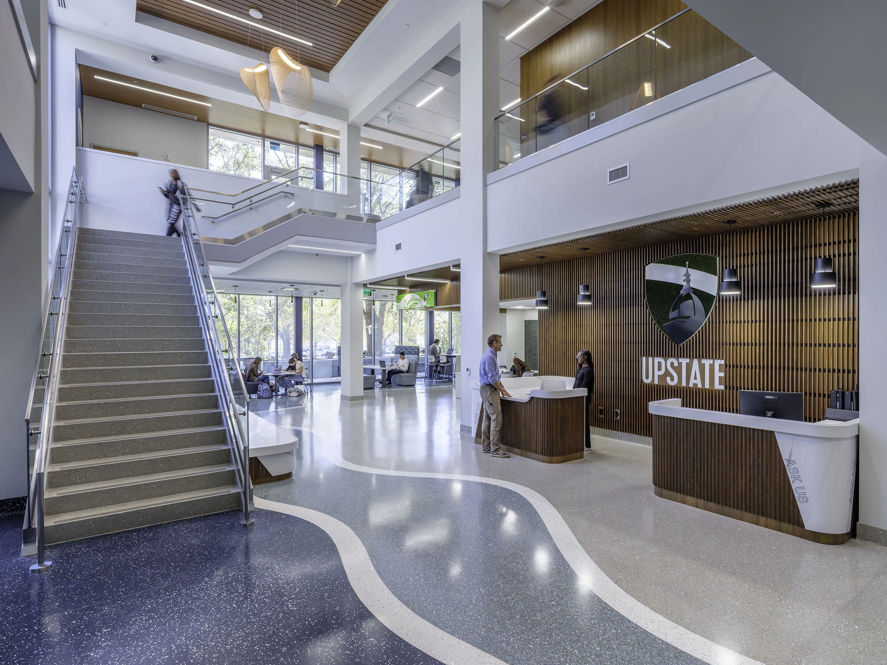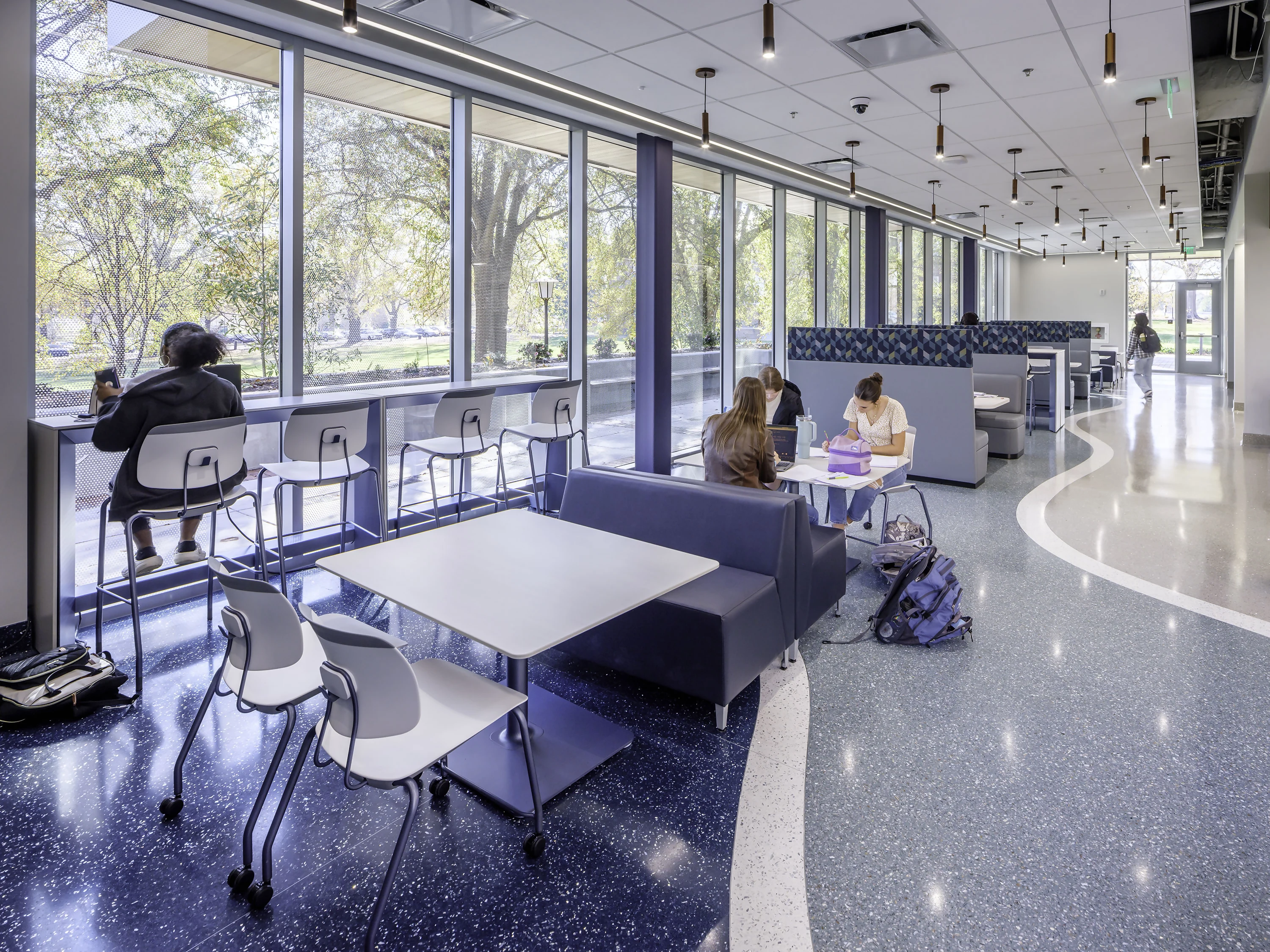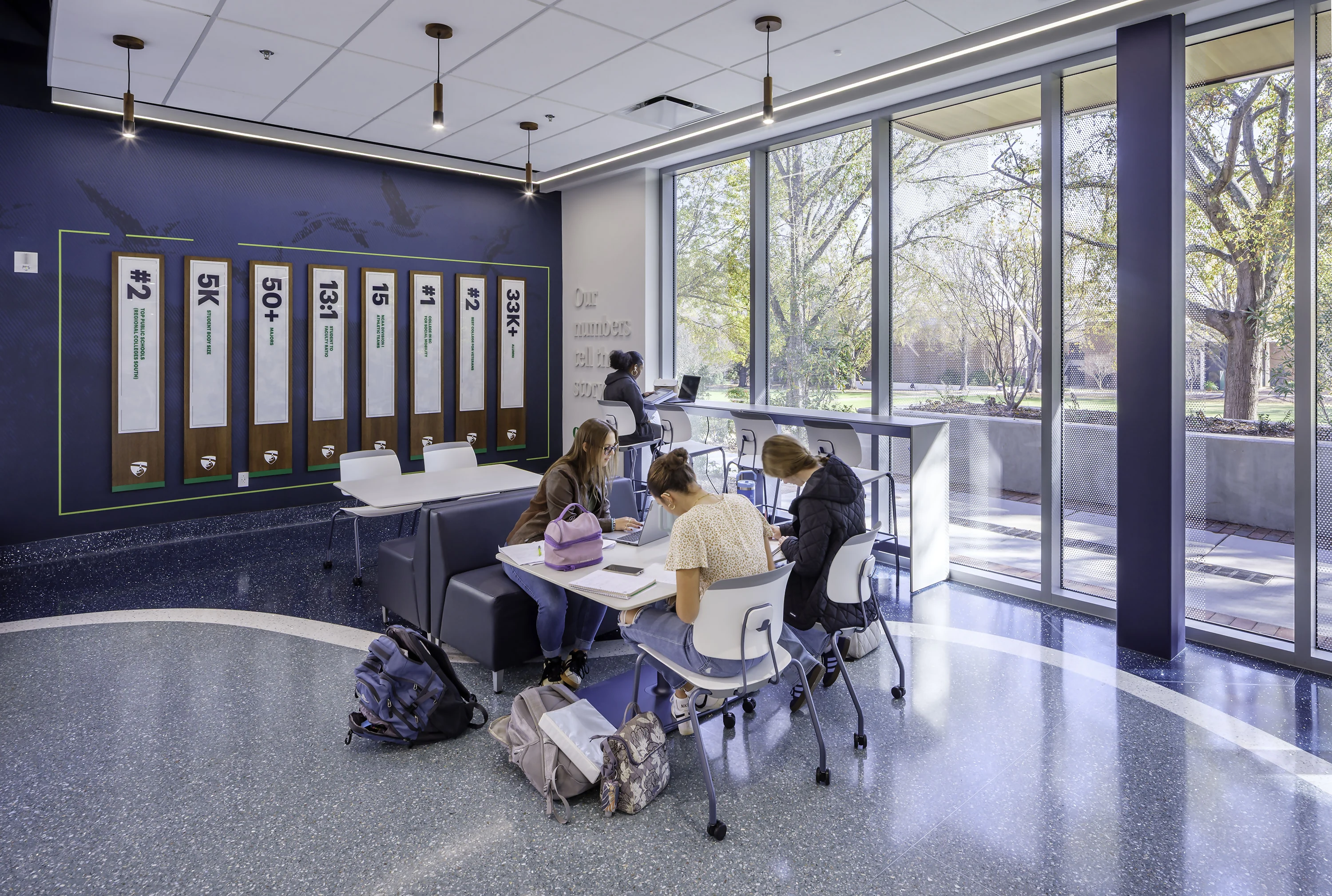 The expanded facility blends with existing campus architecture through selected materials, including brick exteriors and precast concrete columns that match the original structure. Floor-to-ceiling windows, accented by locally sourced wood, bring fresh design elements while filling interior spaces with natural light. This daylight improves alertness and well-being among library users.
