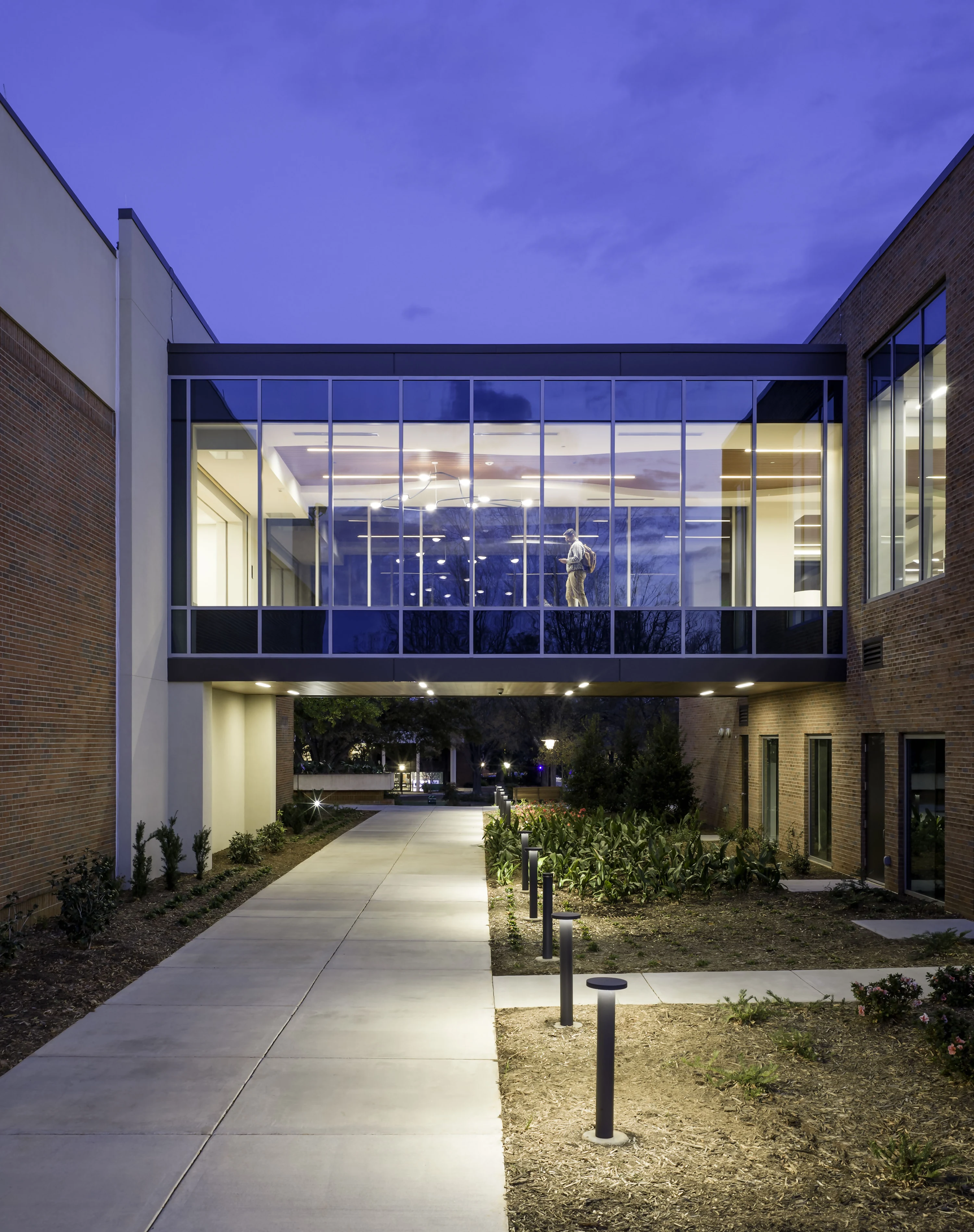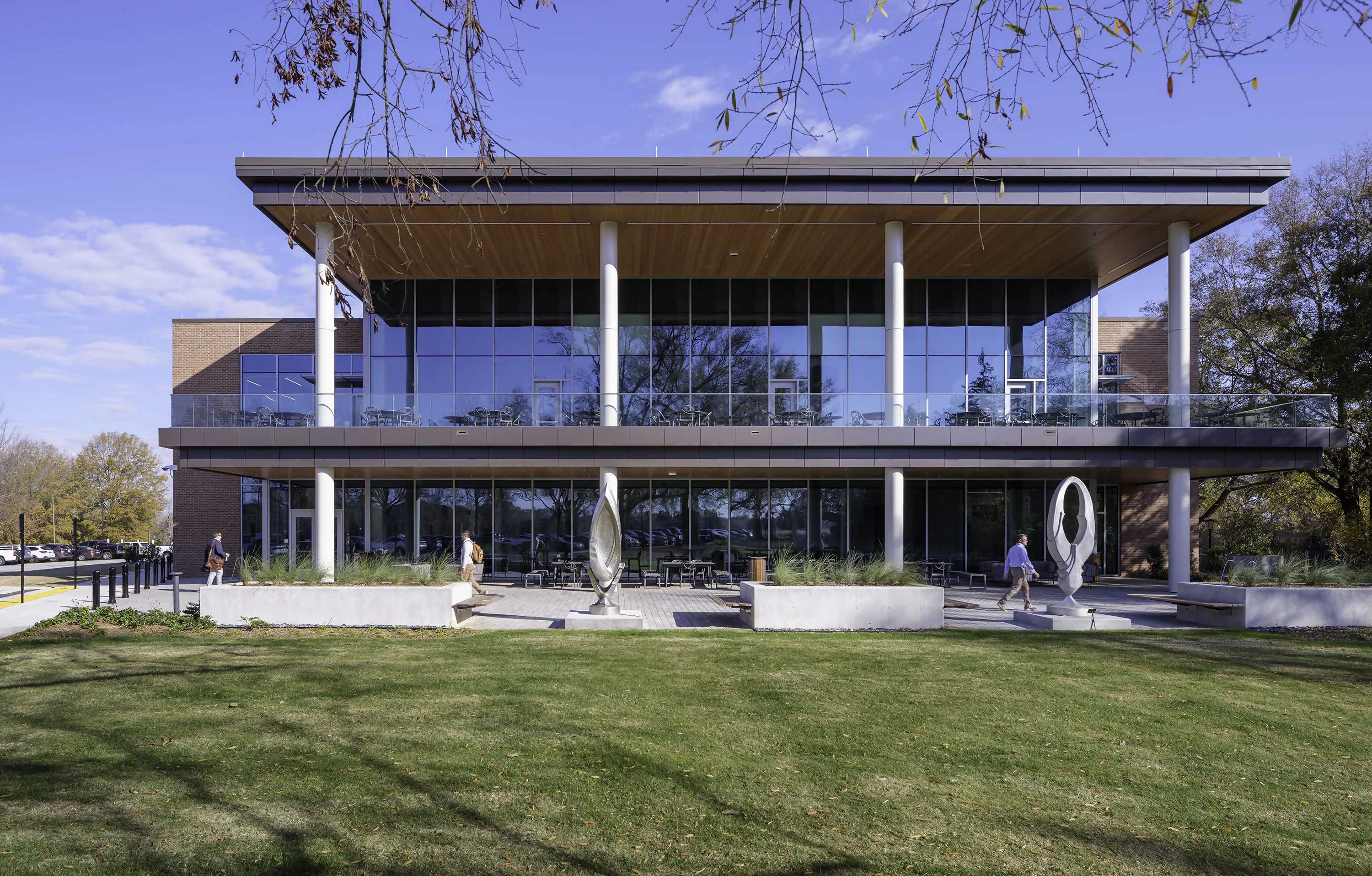 A new entrance improves accessibility and strengthens connections to both parking areas and the Jeffersonian quad. The expansion extends beyond the building, creating an enriched outdoor environment with study areas, a sculpture garden, and landscaping that coordinates with the existing campus grounds.